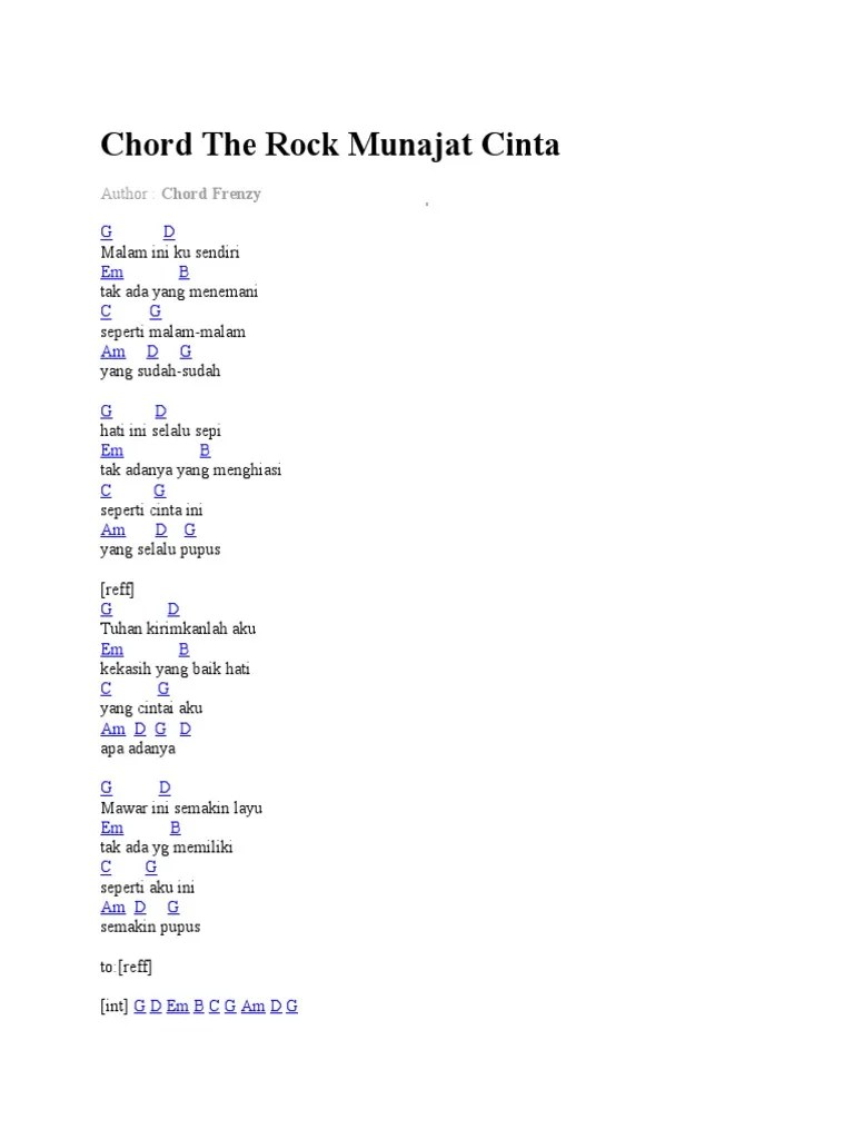 Am e tak ada yang menemani Am e tak ada yang menemani. intro c c g malam ini ku sendiri. C c g malam ini ku sendiri. Explain your version of song meaning, find more of lirik & kord the rock lyrics. C c g malam ini ku sendiri am e tak ada. File_download download as pdf music_note midi. Kunci gitar the rock munajat cinta triad chord lirik. Original lyrics of munajat cinta song by lirik & kord the rock. T.r.i.a.d (sebelumnya bernama the rock). Selalu sepi tak ada yang menghiasi seperti cinta ini yang selalu pupus tuhan . Layanan mobile dari situs entertainment terbesar indonesia, .